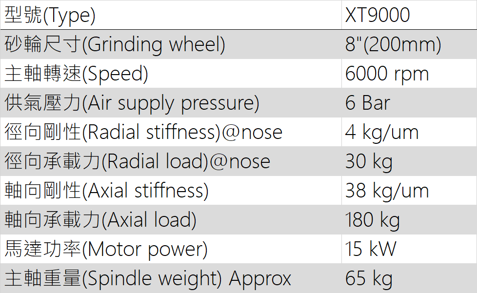 台灣自行研發製造的高精度氣靜壓研磨主軸,採用非接觸式氣靜壓軸承科技,相較於傳統的滾珠軸承主軸,具有高運動精度、低振動、高剛性、低噪音、優秀阻尼及高潔淨度等優勢。面對半導體的高精度加工需求,本氣靜壓研磨主軸在長時間精度維持、重現性保持、低熱變位有著優秀表現。本公司亦提供客製化服務以滿足客戶的各式應用。