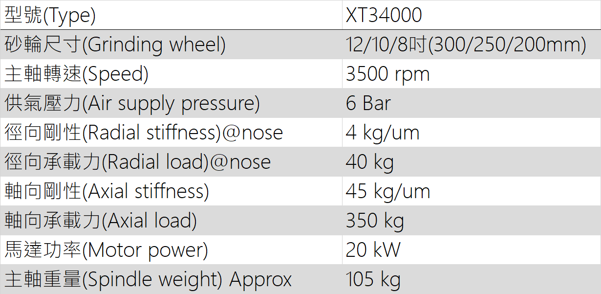 全新一代的XT34000氣靜壓12吋晶圓研磨主軸,提供了更高的軸向承載力,較前一代提升了90%的軸向承載力,對於近期硬脆材料研磨需求,提供了更高的生產效率,非常適合SiC晶圓研磨減薄加工應用。XT34000氣靜壓研磨主軸採用進口電機,提供了大功率的輸出、超低的震動,以及可靠的加工壽命。