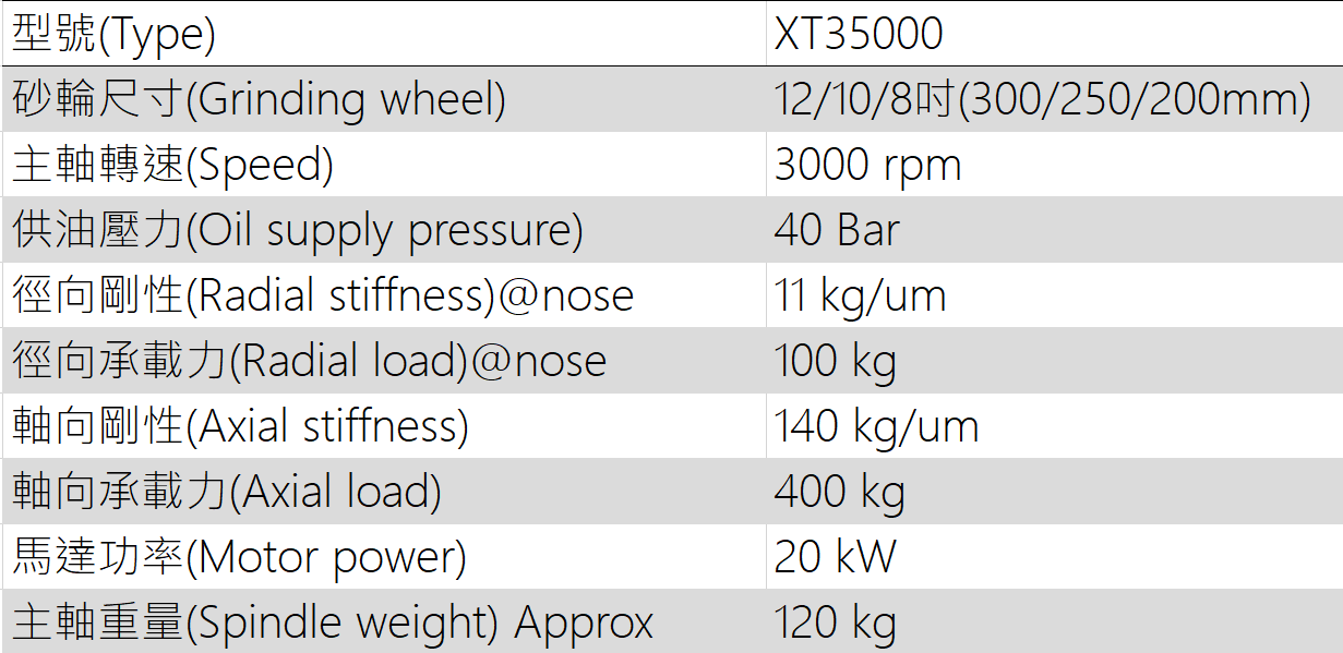 全新開發的XT35000液靜壓12吋晶圓研磨主軸,提供客戶端超高的軸向承載力,對於硬脆材料研磨需求,提供了更高的生產效率,非常適合SiC晶圓研磨減薄加工應用。XT35000液靜壓研磨主軸亦採用進口電機,提供了大功率的輸出、超低的震動,以及可靠的加工壽命。